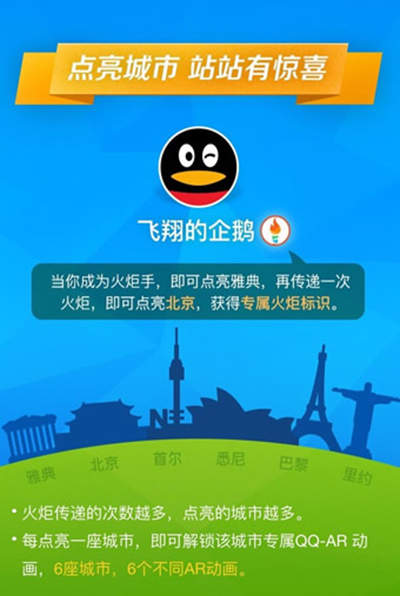 当你成为火炬手,即可点亮雅典,再传递一次火炬,即可点亮北京,获得专属火炬标识。