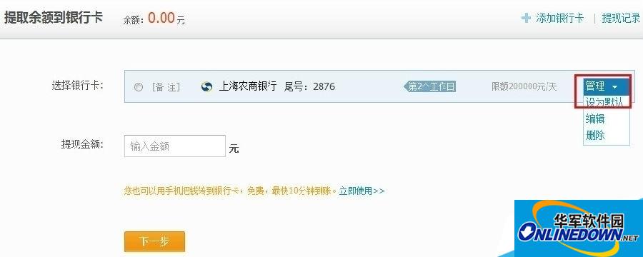 在提现页面对应的银行卡后,点击“管理”——“设为默认”,下次再进入提现后就优先只展示该卡信息,直接填写提现的金额即可。如图2所示