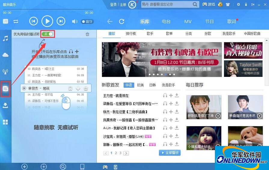 酷狗先升级到最新版本,然后点击左边有个“临”字样的按钮,点下去进入到第二个画面。把优先使用临时播试听功能打开即可。临时播试有一个好处就是听完歌曲后,如果退出酷狗音乐再重新打开之前的播放列表自动帮你清空了。不需要每次自已手动清空列表。