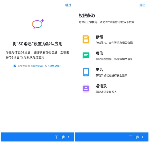 安装后,APP会建议将其设为默认的短信应用,同时需要勾选电话、联系人、存储等多项权限。有网友试用后发现,移动甚至会发送订阅新消息应用相关服务的短信(资费0元)。