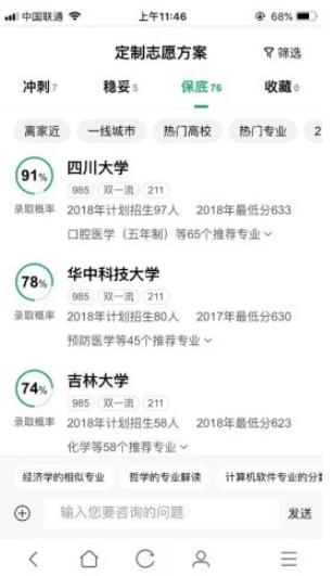 在志愿填报建议中,“搜狗高考志愿君”会根据考生的具体情况,罗列提供以“冲刺”、“稳妥”、“保底”为类别的多个院校。同时,在这三大类别中,会提供每一个高校的录取概率、往年招生人数、往年录取最低分数,以及该校录取概率较高的几个专业等情况。帮助考生根据自身实际情况对比高校、选择专业。值得一提的是,考生还可点击“一线城市”、“离家近”等个性化需求,系统会根据具体需求及实际客观情况一并提供针对性方案。