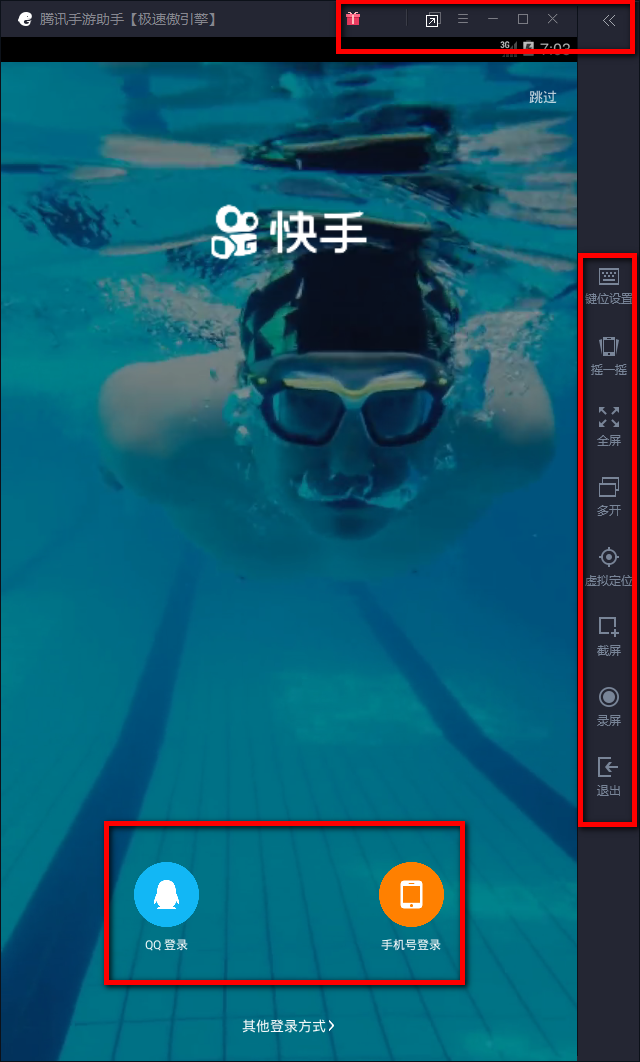 2、在界面顶部的红框中我们可以选择将当前界面放大、最小化、关掉;在界面右侧红框中我们可以设置键位、摇一摇、多开(多个一样软件同时运行)、截屏、录屏等;在界面底部红框中我们可以选择需要的登录方式,如:QQ登录、手机号登录、其他登陆方式;