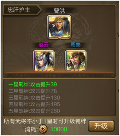 每个武将可以激活三种羁绊,同时也在游戏中会有不同的属性加成,加成的星级数受到每个武将星级的提高而提高,在羁绊列表中需要搭配的武将满足了几星的要求,就可以将羁绊点到几星。