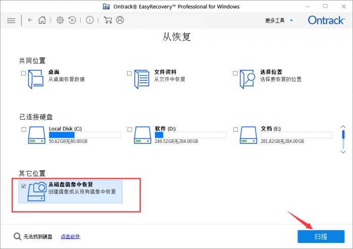 2.在“从恢复”界面,选择“其他位置”选项下的“从磁盘镜像中恢复”选项,单击“扫描”按钮。