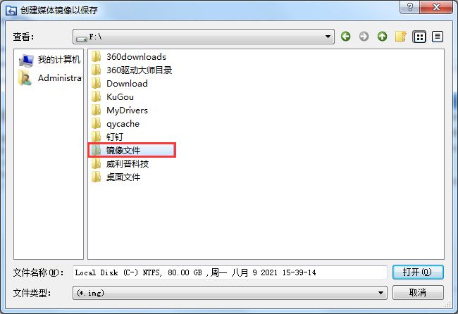 5.在弹出的“创建媒体镜像以保存”窗口中,选择镜像文件的存储位置。在这里小编建议创建镜像的小伙伴新建一个专门用来存储镜像的文件夹,以便日后镜像文件有损坏时,恢复文件比较方便。