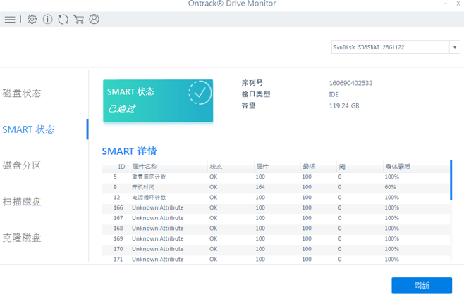 在SMART状态区,我们可以看到磁盘的序列号、接口类型以及容量大小。通过SMART详情区来判断磁盘各部分是否在正常工作,如下图所示:检测完成后会显示状态是否通过。