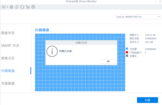 第五步:点击“扫描磁盘”。扫描磁盘可以查看磁盘中是否有坏道以及坏道分布。扫描区域显示蓝色方块则表示硬盘健康,出现红色方块则表示硬盘出现坏道。需要注意的是,当硬盘的坏道超过30%时,就应该停止使用。