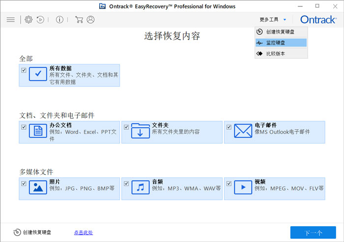首先,打开软件EasyRecovery,出现的是“选择恢复内容”页面,点击页面右上角“更多工具”能够选择使用“监控硬盘”功能。
