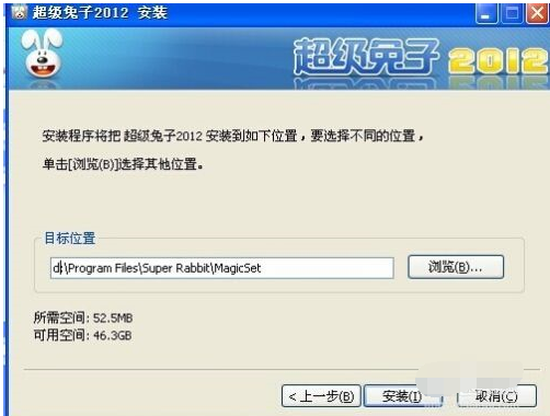 单击【我接受】按钮,打开【安装位置】对话框,单击【浏览】按钮在【目标位置】文本框中设置超级兔子的安装位置,也可采用系统默认安装位置。