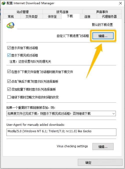 第四步:然后我们在“连接”选项卡中,点击“自定义下载进度对话框”右侧的“编辑...”按钮(如图所示)。