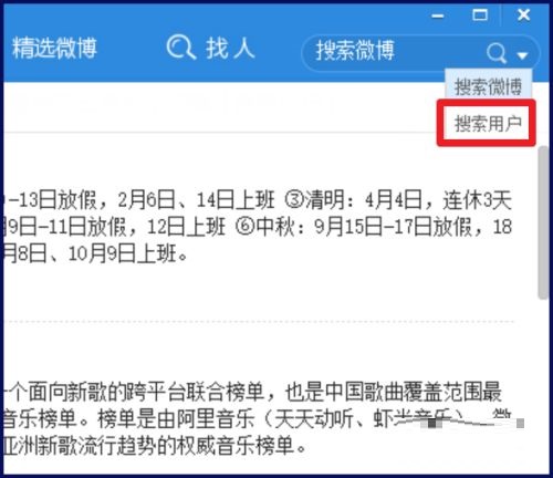 第五步:如果要搜索具体的用户,点击搜索框后的三角形,选择【搜索用户】(如图所示)。