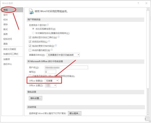 第四步:弹出“选项”设置对话框,选择“常规”,选择“office背景”(如图所示)。