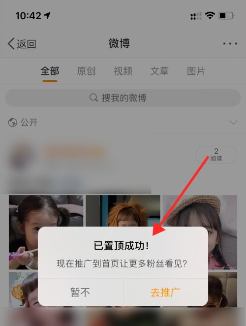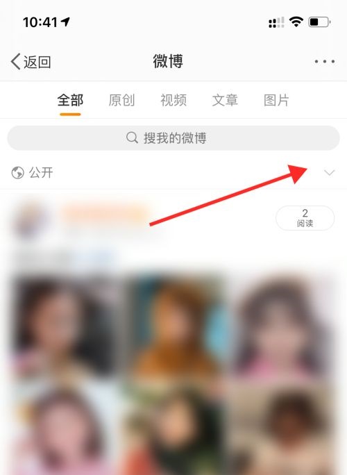 第二步:再选择置顶的微博,点击右侧的“︿”图标,如下图箭头指示所示。