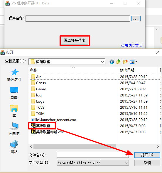 第二步:然后找到英雄联盟,在英雄联盟的游戏安装目录选择“exe”程序,然后在软件中点击“隔离打开程序”按钮就可以实现多开了(如图所示)。