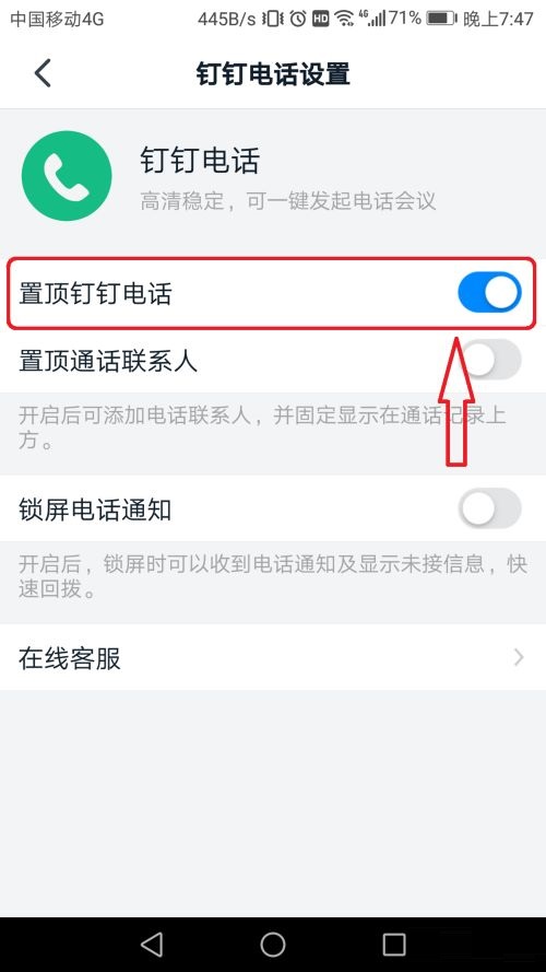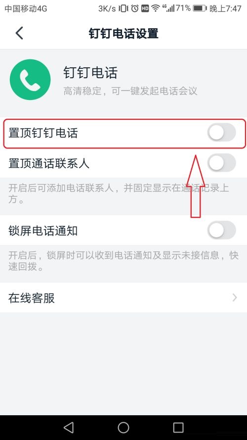 第四步:接下来点击“置顶钉钉电话”右边按钮(如图所示)。