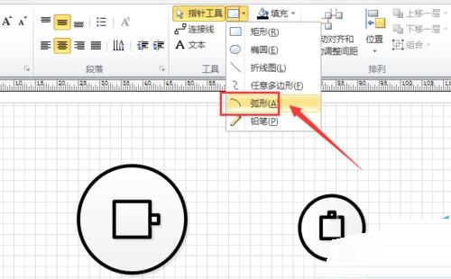 第五步:在上方工具栏中找到“弧线”形状,从上方和下方将两个整体形状连接起来并调整他们的粗细和颜色,如图所示。
