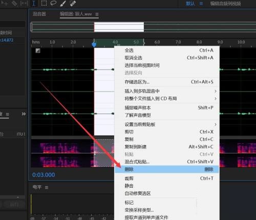 第三步:在选中的音频上右击,在弹出的菜单中选择“删除”(如图所示)。