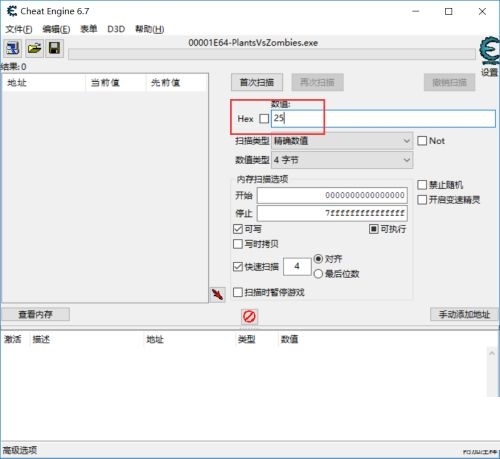 第三步:在ce修改器里面填写阳光数量25并点击首次搜索(如图所示)。