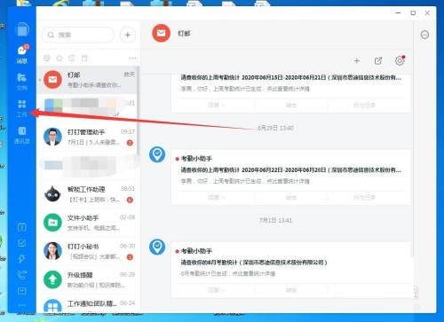 第一步:打开钉钉电脑板,然后在左侧的功能列表中点击工作台(如图所示)。