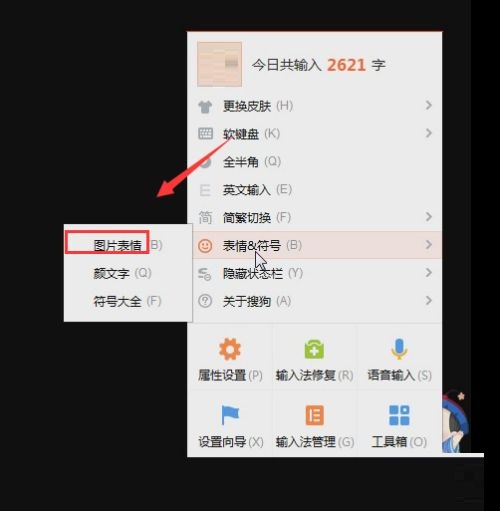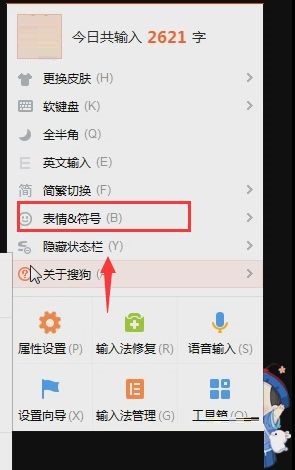 第二步:鼠标放在输入法上,点击左键,选择表情符号(如图所示)。
