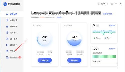 第二步:进入联想电脑管家页面后左下角点击工具箱(如图所示)。
