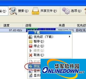 第二步:使用电驴下载视频文件,待下载到一定数据量时,右键单击正在下载的任务,在弹出的快捷菜单中选择"预览"(如图2),这时电驴便会自动调用Kmplayer预览正在下载的视频文件的临时文件。