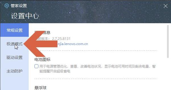 接着,点击设置中心对话框左侧的【极速模式】选项卡。