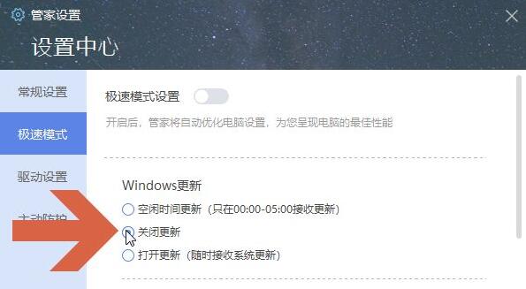 点击选择极速模式选项卡中的【关闭更新】选项。