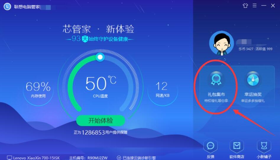 然后,在联想电脑管家首页找到‘礼包集市 ’按钮,点击进入礼包集市页面 。