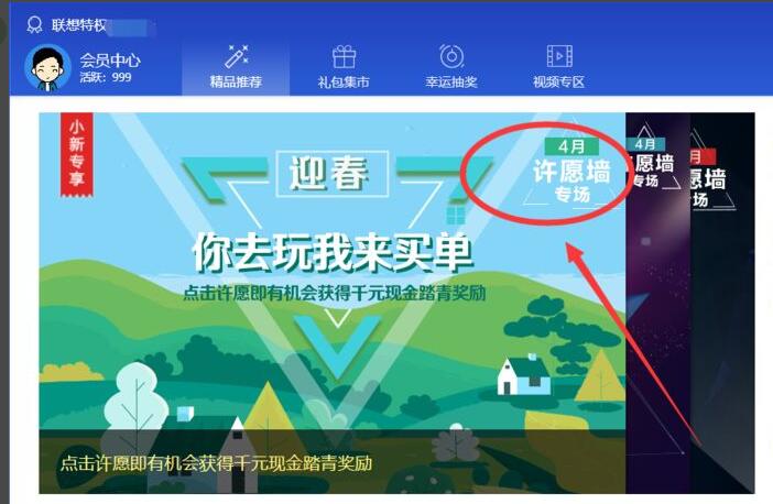 接着,在精品推荐页面看到一个写着小新专享,X月许愿墙专场的大画面,直接点击这个页面。