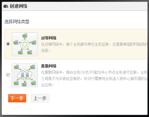 填写网络信息,即网络名称和描述后,进入下一步网络选型。向日葵VPN服务提供的网络类型包括:对等网络和集散网络。在对等网络中,每个主机都与其它主机互联,这是最典型的网络拓扑选择。在集散网络中,每台主机(分支)只能与中心节点主机进行互联,主机之间是不允许彼此互联的,针对只需要将主机连入到中心服务器的企业应用。用户可根据自己的需要进行选择。
