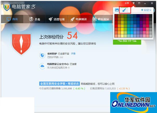 2.电脑管家还支持只换自己喜欢的一个颜色。在换肤窗口中点击“颜色刷子”,可以选择自己喜欢的颜色。