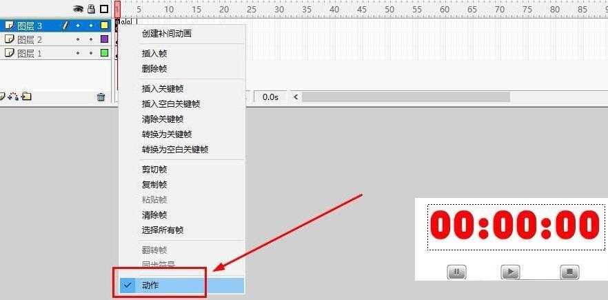 第十步,第一帧上右键选择动作,打开动作面板,输入如图代码