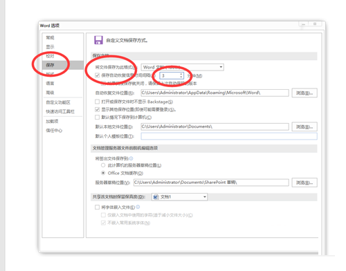 第三步:在打开的word选项窗口中,点击左侧的保存标签,然后在右侧的详情页面中,勾选并设置自动保存的时间,最后点击下方的确定按钮(如图所示)。