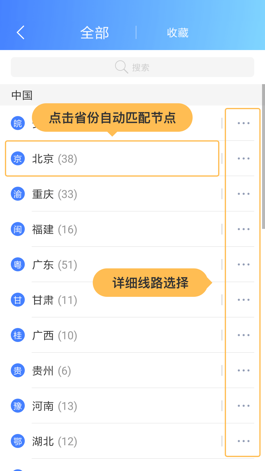 第二步:首页点击服务器按钮,进入服务器列表。爱加速支持【自动匹配节点】功能,点击所需省份即可为您自动选择合适的服务器。如需具体线路,请点击省份右方按钮根据城市进行线路选择。