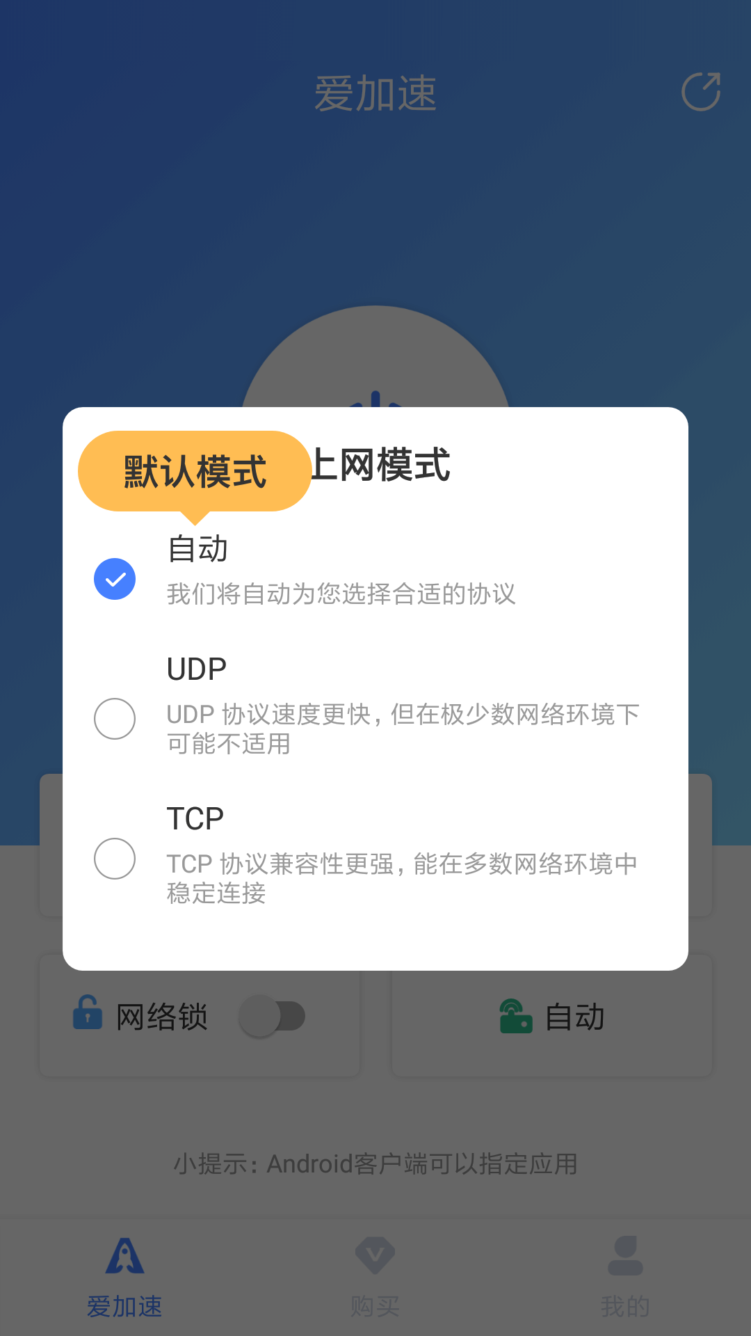第五步:首页可设置上网模式,上网模式包括:自动、UDP协议、TCP协议。推荐设置自动模式(默认模式)。