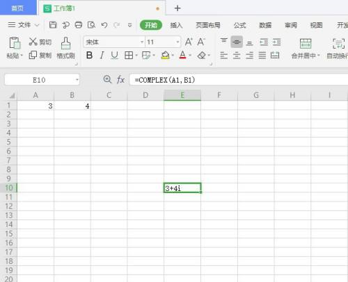 第六步:在单元格E10中,输入"=COMPLEX(A1,B1)"内容,即表示将A1和B1单元格中所对应的实部和虚部转换成一个复数。