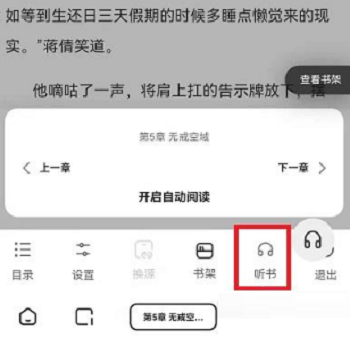 第三步:在内容界面点击中间位置,就会弹出功能设置,用户可以在下方找到【听书】按钮,就可以进入到听书模式了。