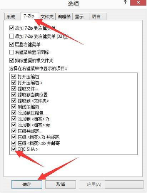 第三步:选择“7-Zip”,下拉勾选“CRC SHA 〉”复选框,点击“确定”。