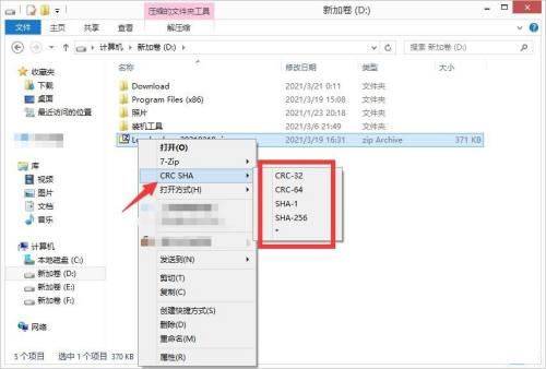 第四步:右击要校验CRC或SHA的文件,选择“CRC SHA”,再选择要查看的校验码即可查看。