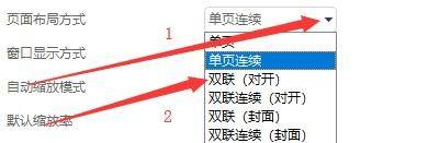 第四步:在“显示”窗口中,点击“页面布局方式”按钮,在弹出栏目框中,点击“双联(对开)”(如图所示)。