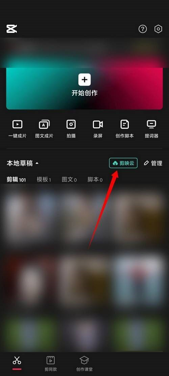 第一步:首先打开剪映APP的首页,点击左侧剪映云的选项。