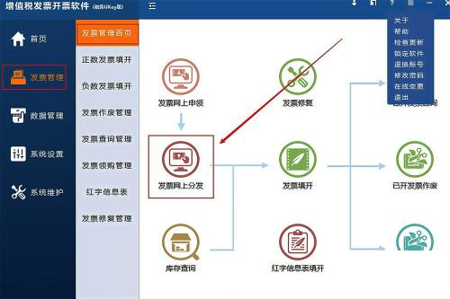 第一步:登录增值税发票开票软件Ukey版,选择发票管理模块,点击发票网上分发。