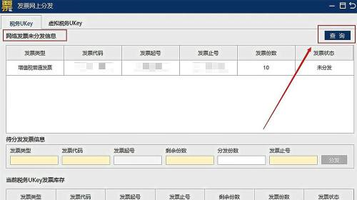第二步:打开发票网上分发页面,在网络发票未分发信息栏目点击查询,系统自动列出未分发发票的信息。