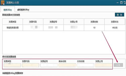 第三步:在待分发发票信息栏目录入本次需分发的发票信息,点击分发按钮即可。