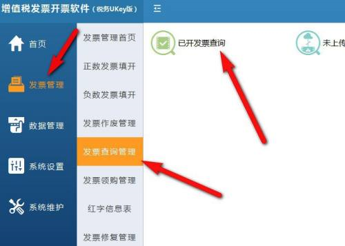 第一步:打开增值税发票开票软件税务UKey版,单击“发票管理”-“发票查询管理”-“已开发票查询”。