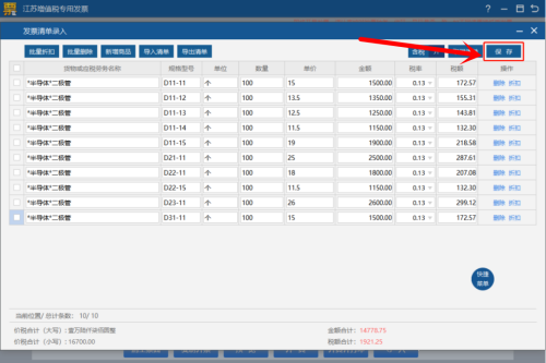 第二步:在发票清单录入界面,可以录入多行明细信息,操作方式是先录入完一行后,点击新增商品,继续填写即可,填写完毕,点击右上角的保存。