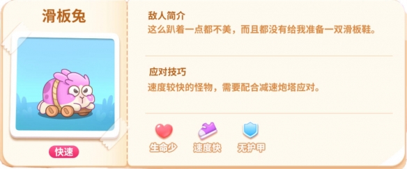 滑板兔趴着滑板上,所以它的速度非常快,但具有生命少,无护甲的特性。如果游戏中出现滑板兔,我们需要建造【减速炮塔】来降低它的速度,从而快速击败它。