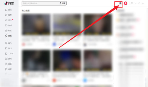 第一步:打开抖音电脑版软件,首页右侧点击查看【摄像机图标】(如图所示)。