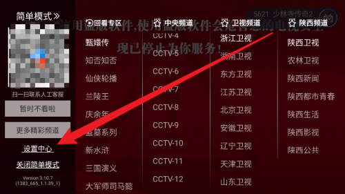 第二步:在电视家3.0主页点击设置中心。